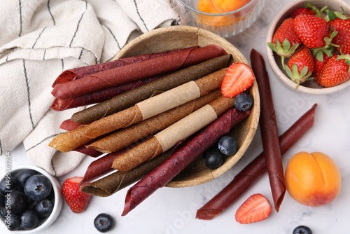 Tasty fruit leather rolls, apricots and berries on white marble table, flat lay