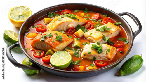 Tasty healthy and nutritious seafood Brazilian fish stew on white or transparent background