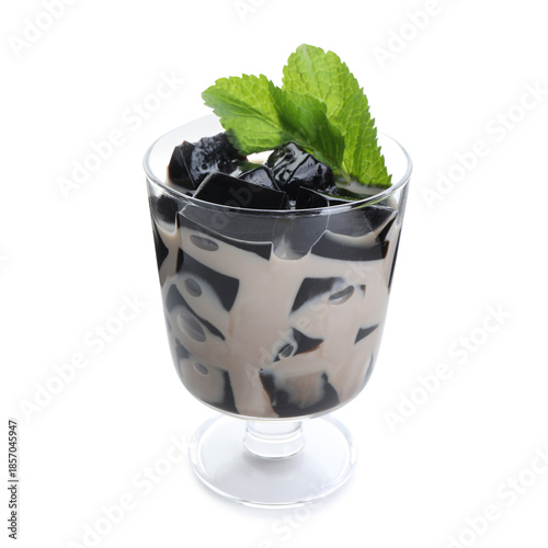 Tasty herbal jelly with milk and mint isolated on white