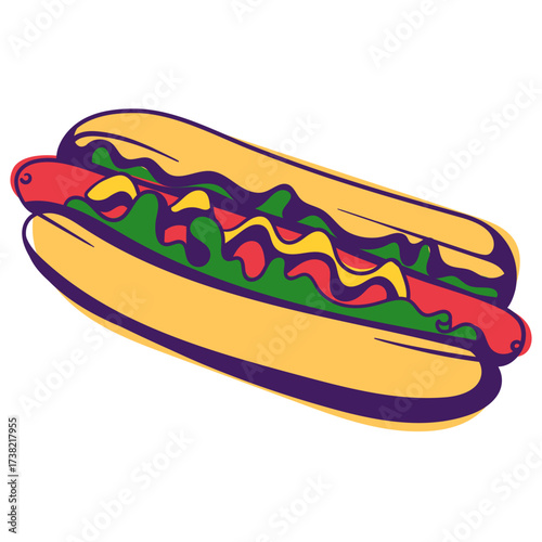Tasty hot dog illustration in retro style with lettuce, yellow mustard on sausage