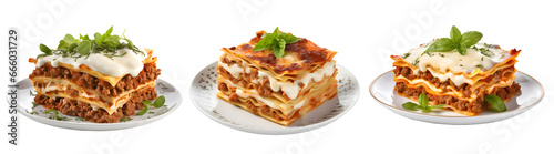 Tasty hot Lasagna served with a basil leaf on white bowl, side view with transparent background, smooth blur edge, Generative AI