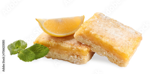 Tasty lemon bars with powdered sugar, fruit and mint isolated on white