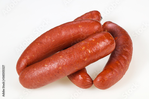 Tasty meat sausages over white background