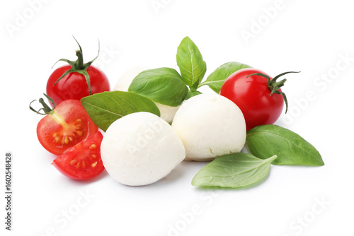Tasty mozzarella cheese balls, tomatoes and basil isolated on white