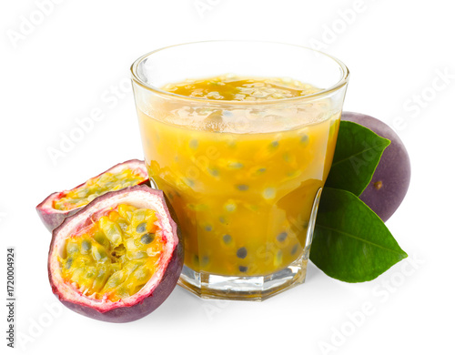 Tasty passion fruit drink and fresh fruits isolated on white