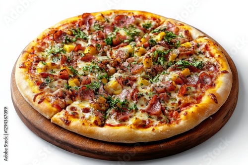 Tasty pizza with ham, pineapple and cheese is resting on wooden board on white background