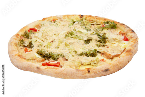 Tasty pizza with salad leaves, cheese, tomatoes. Healthy vegetables pizza. Italian pizza, isolated on white background