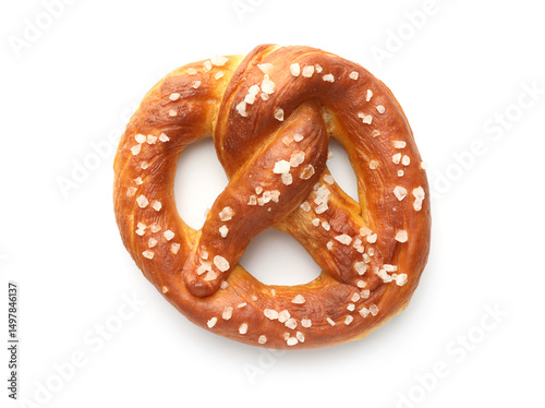 Tasty pretzel with salt isolated on white, top view