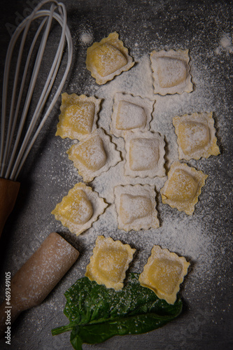 Tasty raw ravioli with flour and spinach on dark background, process of making italian ravioli