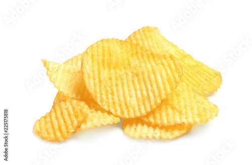 Tasty ridged potato chips on white background