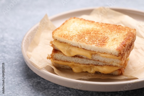 Tasty sandwiches with melted cheese and parsley on grey table, closeup