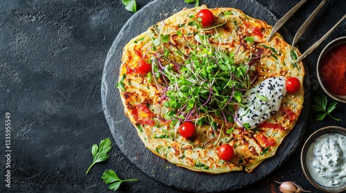 Tasty savory pancake with fresh microgreens tomato sauce and creamy yogurt dressing on dark plate overhead shot