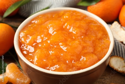 Tasty tangerine jam in bowl on wooden table, closeup