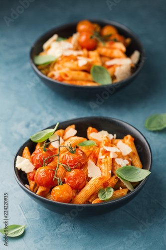 Tasty tomato pasta in bowls on blue table