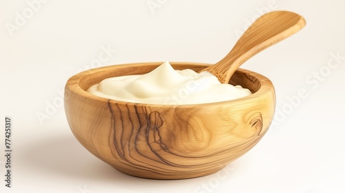 Tasty yoghurt in a wooden bowl isolated on a white background.