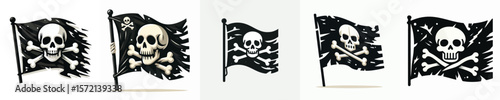 Tattered Pirate Flag Clipart Set – Skull and Crossbones on Waving Black Flags