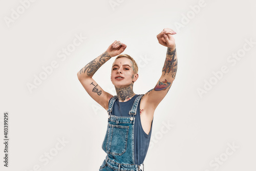 Tattoo and piercing. A white tattooed woman with piercing dancing alone wearing a denim overall looking into a camera