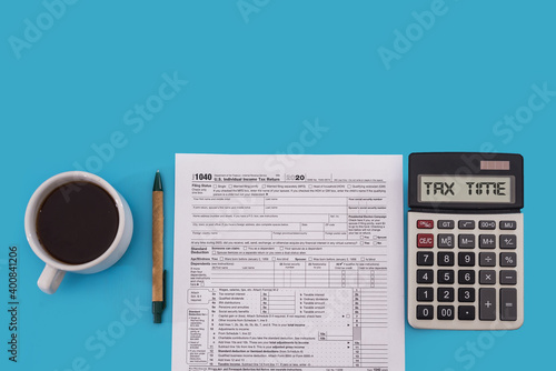Tax concept. US tax form with calculator, pen and coffee cup on blue background. 1040 form for filling in April.