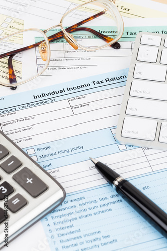 Tax form with calculator, glasses, keyboard, and pen; document are mock-up