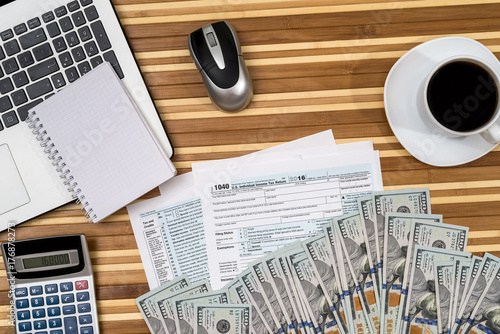 tax form with coffee, laptop, pen and calculator and dollar