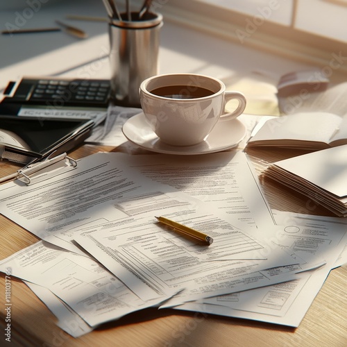 Tax preparer desk with coffee stapler and open forms in natural light office environment work routine concept