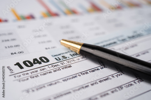 Tax Return form 1040 and dollar banknote, U.S. Individual Income.