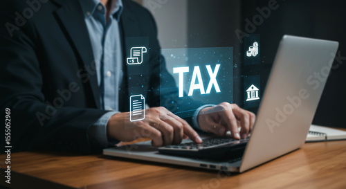 Tax Season: A business man types "TAX" on a laptop surrounded by business and accounting icons in the foreground, symbolizing financial management and responsibility.