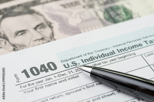 Tax time concept, pen on 1040 US individual income tax filling form with US dollar bill, calculate from yearly revenue to pay the government