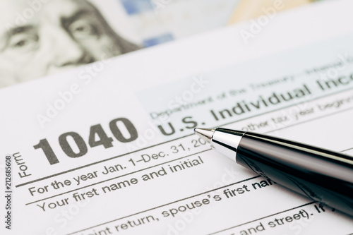 Tax time concept, selective focus on pen on 1040 US individual income tax filling form with US dollar bill, calculate from yearly revenue to pay the government