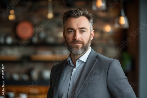 T&D manager (Training and Development Manager). A well-dressed man with a beard stands confidently in a cozy cafe setting, featuring a rustic brick wall and warm lighting.