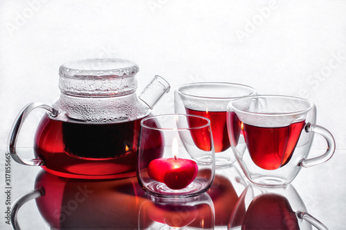 Tea for two in mugs of hearts with a burning candle in the shape of a heart in a transparent candlestick on a glass table with reflection