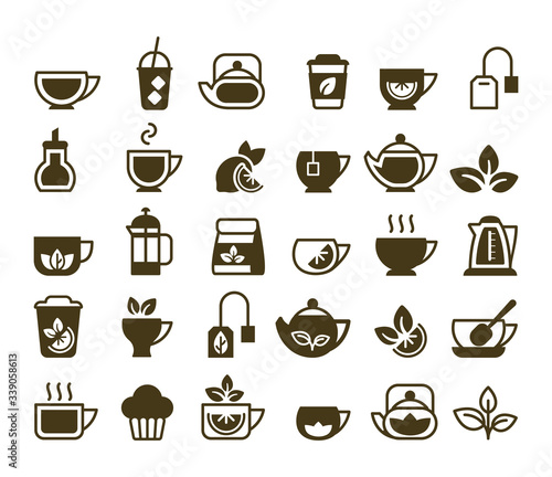 tea icons. hot and cold drinks symbols cup of green leaves for black tea coffee cupcakes kettle. Vector black pictures