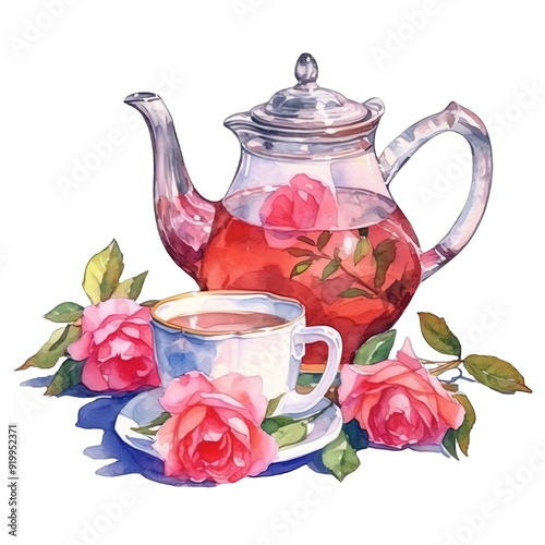 Tea party tea pot and tea cup watercolor illustration, tea party clipart