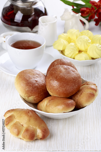 Tea party with buns and meringue cookies.