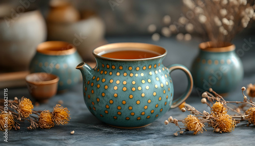Tea service blue and gold teapot, cup, vase, dried florals on textured surface