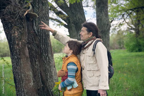 teacher and child are looking at bark of tree, tinder fungus on tree. Children explore and study nature, world around them. Children's curiosity, interest in nature