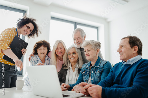 Teacher explaining senior students how to work with laptop, internetbanking. Elderly people attending computer and technology education class. Digital literacy.
