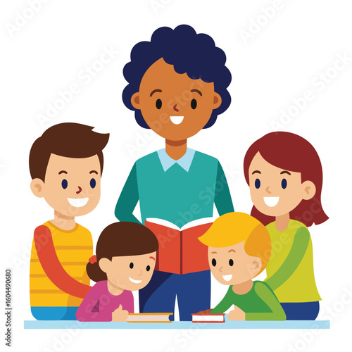 Teacher reading a book to a group of happy children