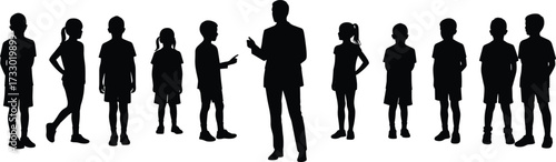 Teacher with children silhouettes, group interaction, black icons, white background, guidance, education, leadership, casual attire, school scene, unity