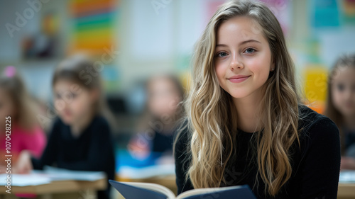 teacher with warm smile reads storybook to young children in colorful classroom, fostering love for reading and learning