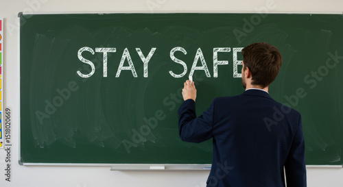 Teacher writing "STAY SAFE" on green chalkboard, school safety message during pandemic