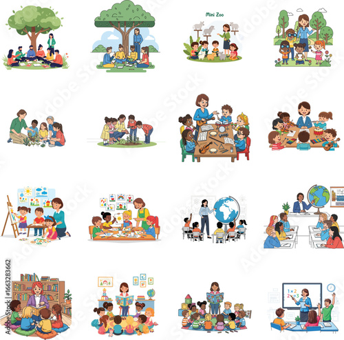 Teachers and children engaged in diverse learning activities outdoors and indoors, showcasing various educational approaches.