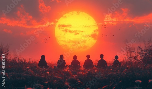 Teacher's Day Celebration Illustration of Students and Teacher under Sunset