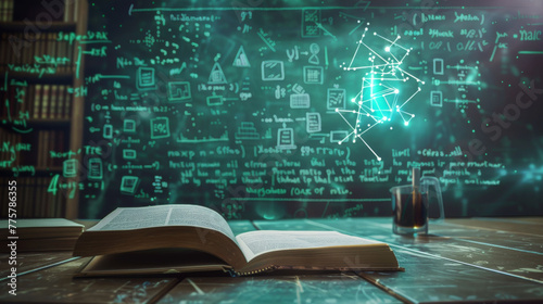 Teacher's desk with textbook, Scientific mathematical symbols on blackboard, concept of education innovation