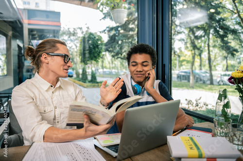 Teachers explanation. Smart young tutor holding a big book while explaining the material to the student