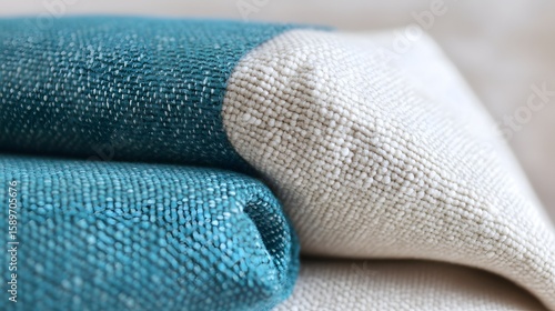 Teal and Beige Textured Fabric Close Up, Woven Textile Detail, Home Decor Material
