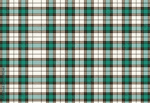 Teal and Brown Tartan Pattern: Discover a Sophisticated Textile Design Featuring a Classic Plaid in Teal, White, and Black with Brown Accents on a Minimalist Background.