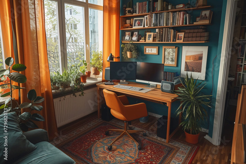 Teal Color Wall of Minimalist Scandinavian Interior Home Office Room, Home Workstation Table Chair, Desk and Frame Plants Vase sunlight from window