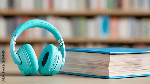 Teal headphones beside book, library background; audiobook concept