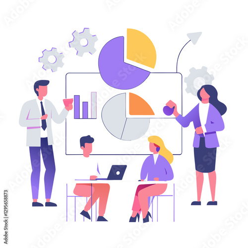 Team analyzing global economy with magnifying glass and dollar signs representing financial strategy
